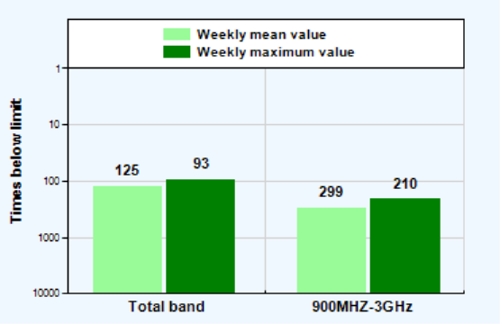 to the stricter (lower) reference level value of the radiofrequency band 1.2 W/m² (red line) and the